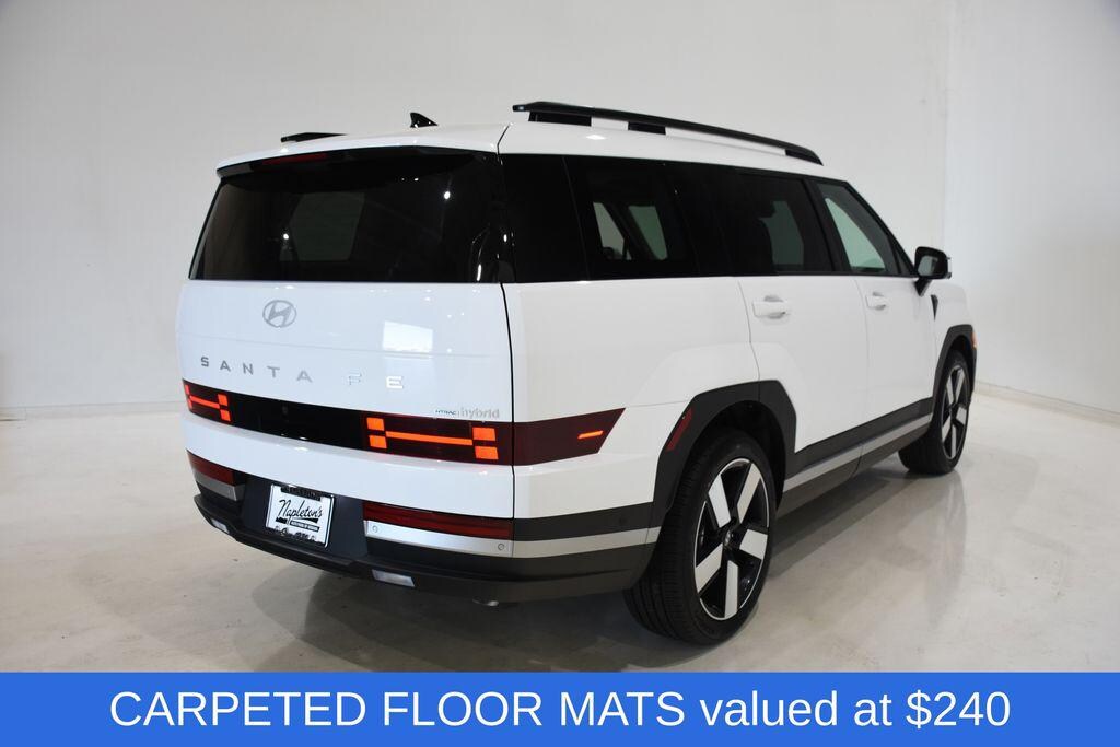 Serenity White This Santa Fe Hybrid Limited is nicely equipped with 7-Passenger Bench Seating, Active Cruise Control, Alloy wheels, Apple CarPlay & Android Auto, Auto High-beam Headlights, Auto-dimming Rear-View mirror, Automatic temperature control, Brake assist, Emergency communication system, Exterior Parking Camera Rear, Front dual zone A/C, Fully automatic headlights, Garage door transmitter: HomeLink, Heated & Ventilated Front Bucket Seats, Heated door mirrors, Heated rear seats, Heated steering wheel, Leather Seat Trim, Memory seat, Navigation System, Power door mirrors, Power driver seat, Power Liftgate, Power moonroof, Power passenger seat, Power windows, Rain sensing wipers, Remote keyless entry, Security system, Wheels: 20" x 8.5J Alloy, 12 Speakers, 3rd row seats: bench, 4-Wheel Disc Brakes, ABS brakes, Air Conditioning, AM/FM radio: SiriusXM, Bumpers: body-color, Cargo Net, Cargo Organizer, Carpeted Floor Mats, Delay-off headlights, Driver door bin, Driver vanity mirror, Dual front impact airbags, Dual front side impact airbags, Electronic Stability Control, Four wheel independent suspension, Front anti-roll bar, Front Bucket Seats, Front Center Armrest, Front reading lights, Heated front seats, Illuminated entry, Knee airbag, Leather steering wheel, Low tire pressure warning, Occupant sensing airbag, Outside temperature display, Overhead airbag, Overhead console, Panic alarm, Passenger door bin, Passenger vanity mirror, Power steering, Radio: AM/FM/HD Bose Premium Audio System, Rear anti-roll bar, Rear side impact airbag, Rear window defroster, Rear window wiper, Speed control, Speed-sensing steering, Split folding rear seat, Spoiler, Steering wheel mounted audio controls, Tachometer, Telescoping steering wheel, Tilt steering wheel, Traction control, Trip computer, Turn signal indicator mirrors, Variably intermittent wipers, and Ventilated front seats.