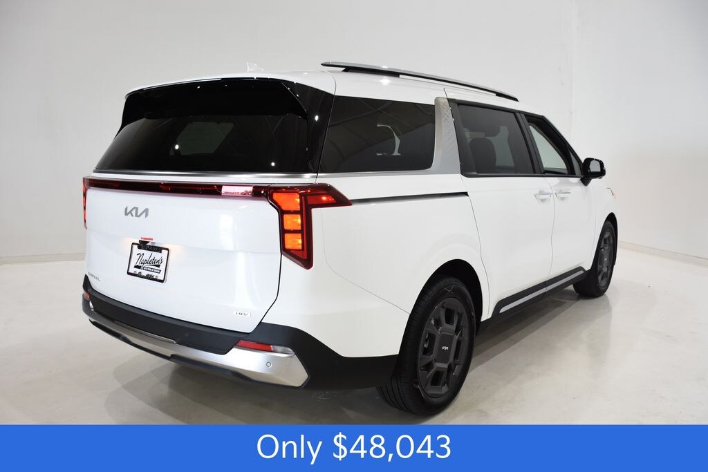 Snow White Pearl This Carnival Hybrid SX is nicely equipped with Active Cruise Control, Alloy wheels, Apple CarPlay & Android Auto, Auto High-beam Headlights, Automatic temperature control, Brake assist, Emergency communication system, Exterior Parking Camera Rear, Front dual zone A/C, Front fog lights, Fully automatic headlights, Heated & Ventilated Front Bucket Seats, Heated door mirrors, Memory seat, Navigation System, Power 2nd-Row Moonroof, Power door mirrors, Power driver seat, Power Liftgate, Power moonroof, Power passenger seat, Power windows, Rain sensing wipers, Remote keyless entry, Security system, 3rd row seats: split-bench, 4-Wheel Disc Brakes, 8 Speakers, ABS brakes, Air Conditioning, AM/FM radio: SiriusXM, Artificial Leather Seat Trim, Bumpers: body-color, Compass, Delay-off headlights, Driver door bin, Driver vanity mirror, Dual front impact airbags, Dual front side impact airbags, Electronic Stability Control, Four wheel independent suspension, Front anti-roll bar, Front Bucket Seats, Front Center Armrest, Front reading lights, Heated front seats, Illuminated entry, Knee airbag, Leather Shift Knob, Leather steering wheel, Low tire pressure warning, Occupant sensing airbag, Outside temperature display, Overhead airbag, Overhead console, Panic alarm, Passenger door bin, Passenger vanity mirror, Power steering, Radio: Navigation System w/SiriusXM, Rear air conditioning, Rear anti-roll bar, Rear reading lights, Rear window defroster, Rear window wiper, Reclining 3rd row seat, Speed control, Speed-sensing steering, Split folding rear seat, Spoiler, Steering wheel mounted audio controls, Tachometer, Telescoping steering wheel, Tilt steering wheel, Traction control, Trip computer, Turn signal indicator mirrors, Variably intermittent wipers, Ventilated front seats, and Wheels: 19" Black Alloy.