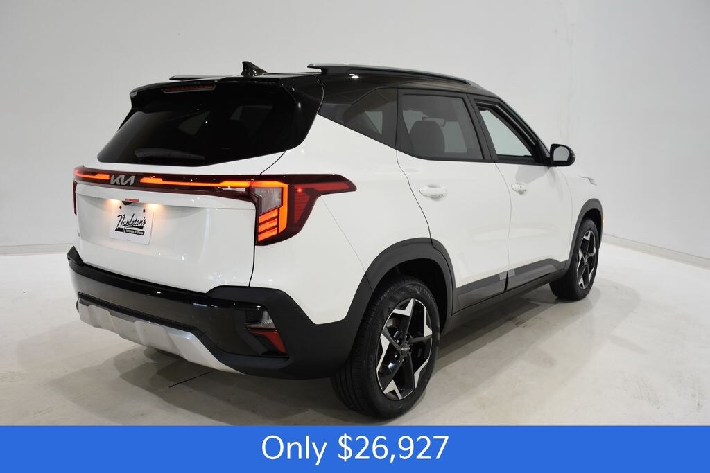 Clear White/Black Roof This Seltos S is nicely equipped with Alloy wheels, Apple CarPlay & Android Auto, Auto High-beam Headlights, Automatic temperature control, Brake assist, Emergency communication system: 911 Connect, Exterior Parking Camera Rear, Front fog lights, Fully automatic headlights, Heated door mirrors, Navigation System, Power door mirrors, Power windows, Remote keyless entry, Security system, Speed control, 4-Wheel Disc Brakes, 6 Speakers, ABS brakes, Air Conditioning, AM/FM radio: SiriusXM, Bumpers: body-color, Cloth & Artificial Leather Seat Trim, Delay-off headlights, Driver door bin, Driver vanity mirror, Dual front impact airbags, Dual front side impact airbags, Electronic Stability Control, Front anti-roll bar, Front Bucket Seats, Front Center Armrest, Front reading lights, Front wheel independent suspension, Illuminated entry, Leather Shift Knob, Leather steering wheel, Low tire pressure warning, Occupant sensing airbag, Outside temperature display, Overhead airbag, Overhead console, Panic alarm, Passenger door bin, Passenger vanity mirror, Power steering, Radio: AM/FM/HD/Satellite Display System w/Navigation, Rear seat center armrest, Rear window defroster, Rear window wiper, Speed-sensing steering, Split folding rear seat, Spoiler, Steering wheel mounted audio controls, Tachometer, Telescoping steering wheel, Tilt steering wheel, Traction control, Trip computer, Turn signal indicator mirrors, Variably intermittent wipers, and Wheels: 17" Alloy w/Machined Finished.