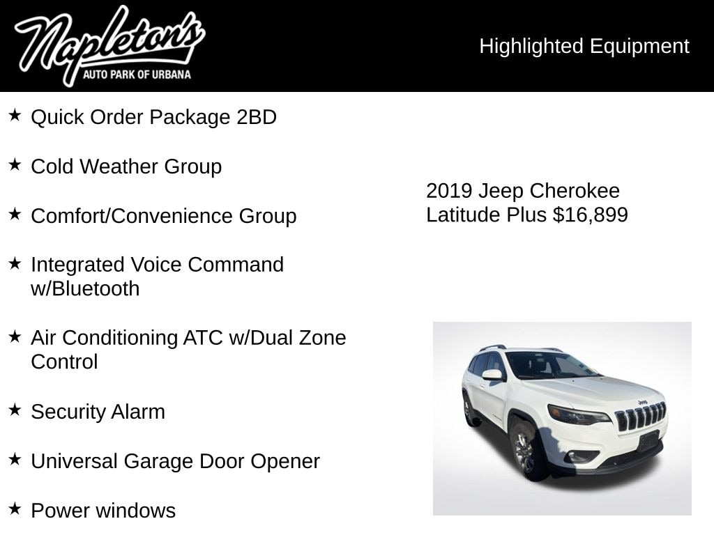 2019 Jeep Cherokee Latitude Plus w/ Comfort Convenience & Cold Weathe rGroups Bright White Clearcoat 2.4L I4 4WD 9-Speed 948TE Automatic 115V Auxiliary Power Outlet, Air Conditioning ATC w/Dual Zone Control, Alloy wheels, Apple CarPlay/Android Auto, Auto-Dimming Rear-View Mirror, Brake assist, Cold Weather Group, Comfort/Convenience Group, Engine Block Heater, Front fog lights, Fully automatic headlights, Heated door mirrors, Heated Front Seats, Heated Steering Wheel, Integrated Voice Command w/Bluetooth, ParkView Rear Back-Up Camera, Power door mirrors, Power driver seat, Power Liftgate, Power windows, Quick Order Package 2BD, Remote keyless entry, Remote Start System, Security Alarm, Speed control, Universal Garage Door Opener, Windshield Wiper De-Icer.