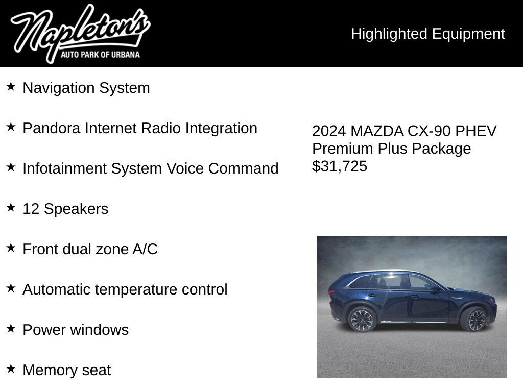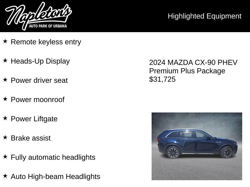 The standout features of this CX-90 PHEV include: - Heads-Up Display - Nappa Leather Seat Trim - Ventilated Front Seats - Power Liftgate - Automatic Temperature Control - Navigation System - Bose 12-Speaker Audio System - Active Cruise Control - Auto High-Beam Headlights - Garage Door Transmitter.
