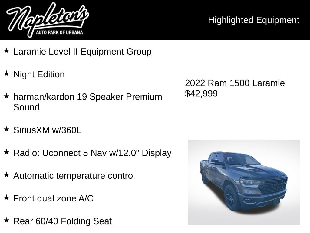 Introducing the 2022 Ram 1500 Laramie Night Edition with the Level II Equipment Group - a powerful and sophisticated full-size pickup that's ready to elevate your driving experience. This exceptional vehicle combines rugged capability with a refined, stylish presence, making it the perfect choice for those who demand the best.