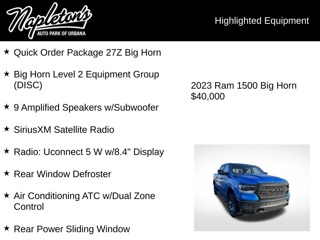 Discover the power and versatility of the 2023 Ram 1500 Big Horn Built to Serve Edition with the Level 2 Equipment Group. This exceptional truck is designed to take on any challenge, whether you're conquering the open road or tackling your toughest jobs.